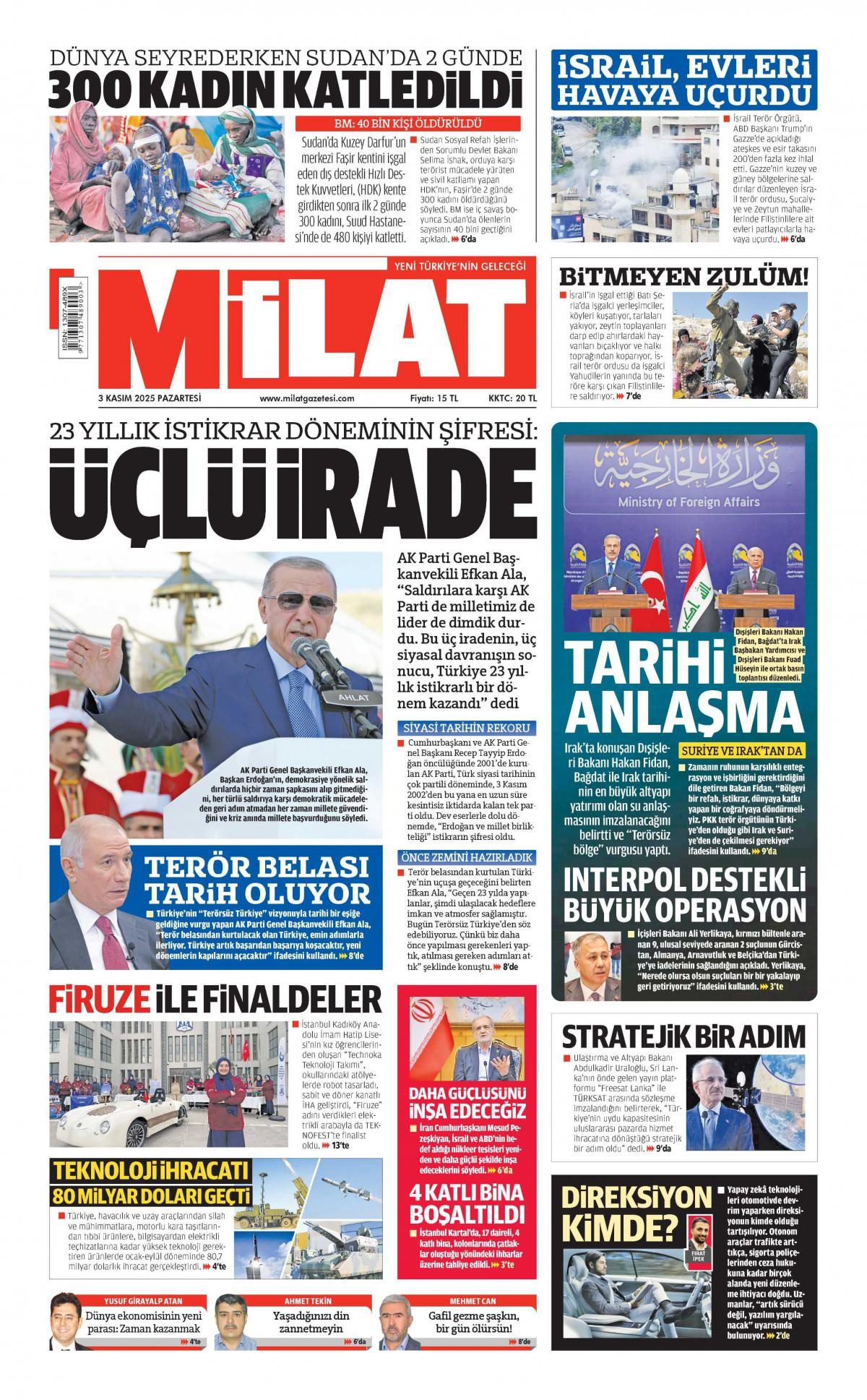Milat Gazetesi 3 Kasım 2025 Günü Manşeti